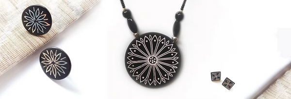 Indigo Upcycled Fabric and Repurposed Wood Maze Necklace